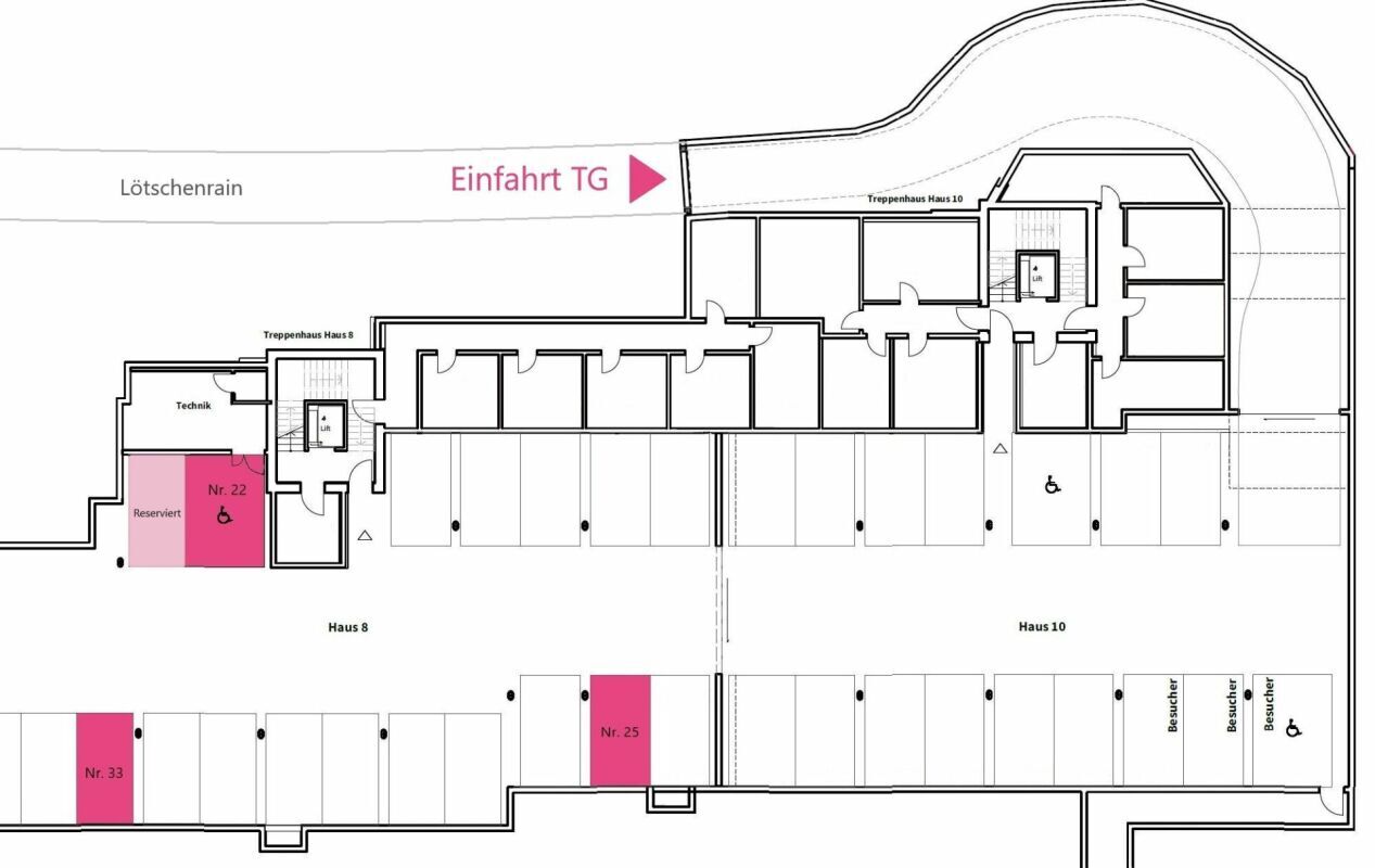 Die Garagenparkplätze in der Überbauung Lötschenrain bieten Schutz vor Witterung, eine zentrale Lage und sind bereits für E-Mobility vorbereitet, sodass bei Bedarf eine Wallbox installiert werden kann. Der Zugang erfolgt bequem über den Lötschenrain oder zu Fuss über die Lötschenmattstrasse.