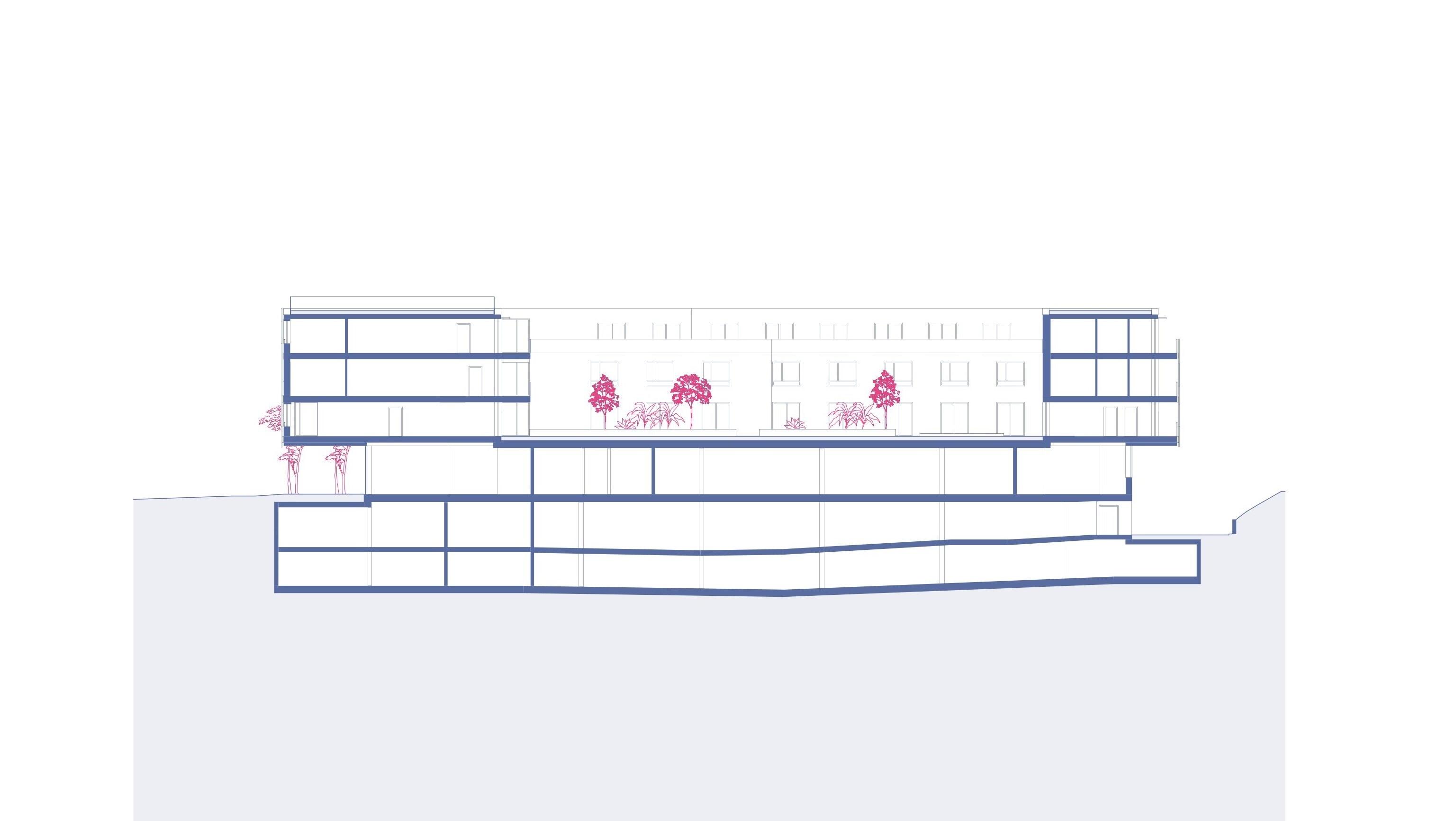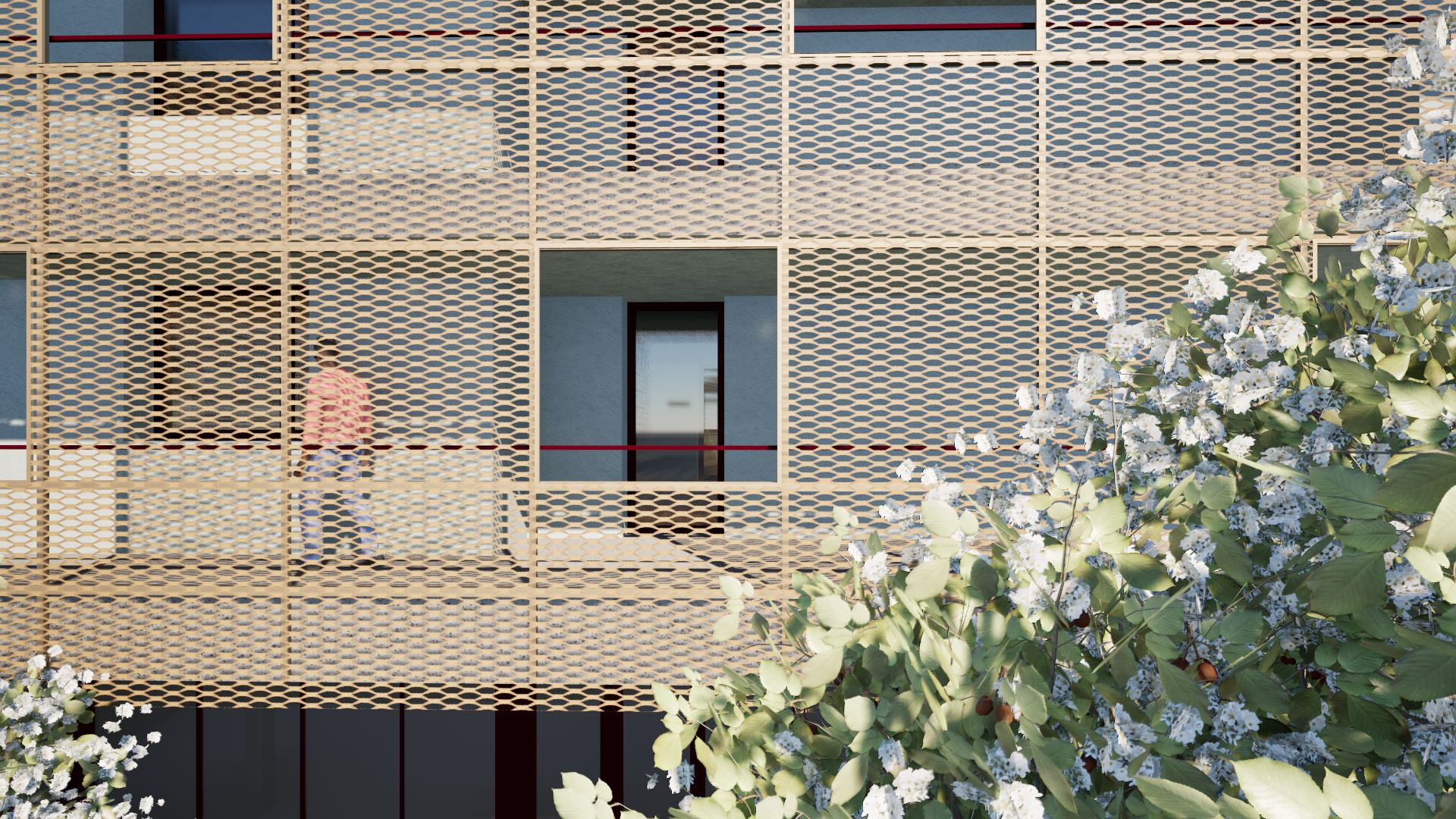 Das zurückversetzte Erdgeschoss akzentuiert die Zugänge zu den Gewerbeflächen und formuliert einen klaren, selbstverständlichen Übergang zwischen öffentlichem Raum und Gebäude. Darüber entwickelt sich ein eigenständig gestalteter Baukörper mit differenzierter Fassadensprache: Fein abgestimmte Materialien, Farbnuancen und Transparenzen verleihen dem Volumen Tiefe und eine ruhige Präsenz .